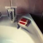 I badrummen finns separat toalett och badkar. Det finns också badlakan och handdukar.